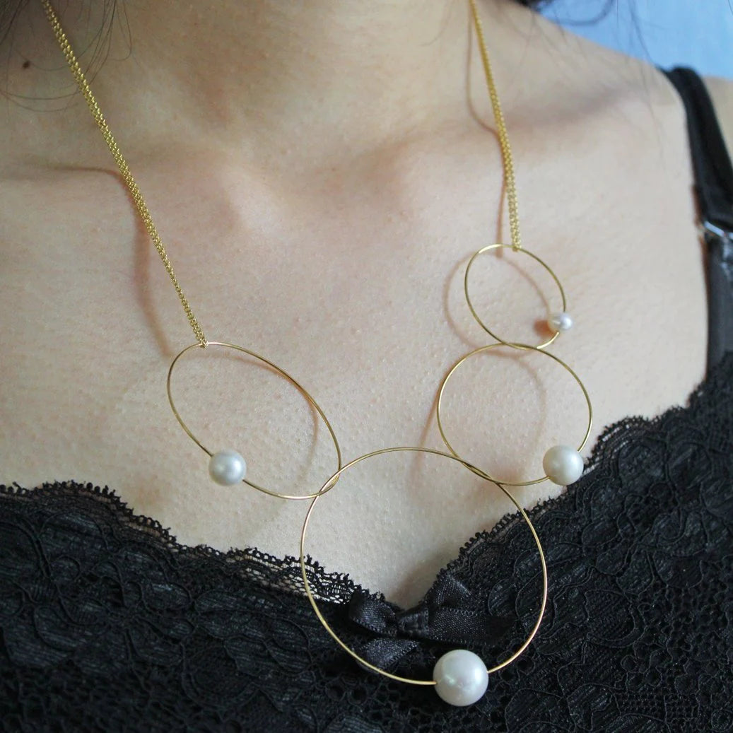 Double Circle Pendant Necklace with Round Freshwater Pearls