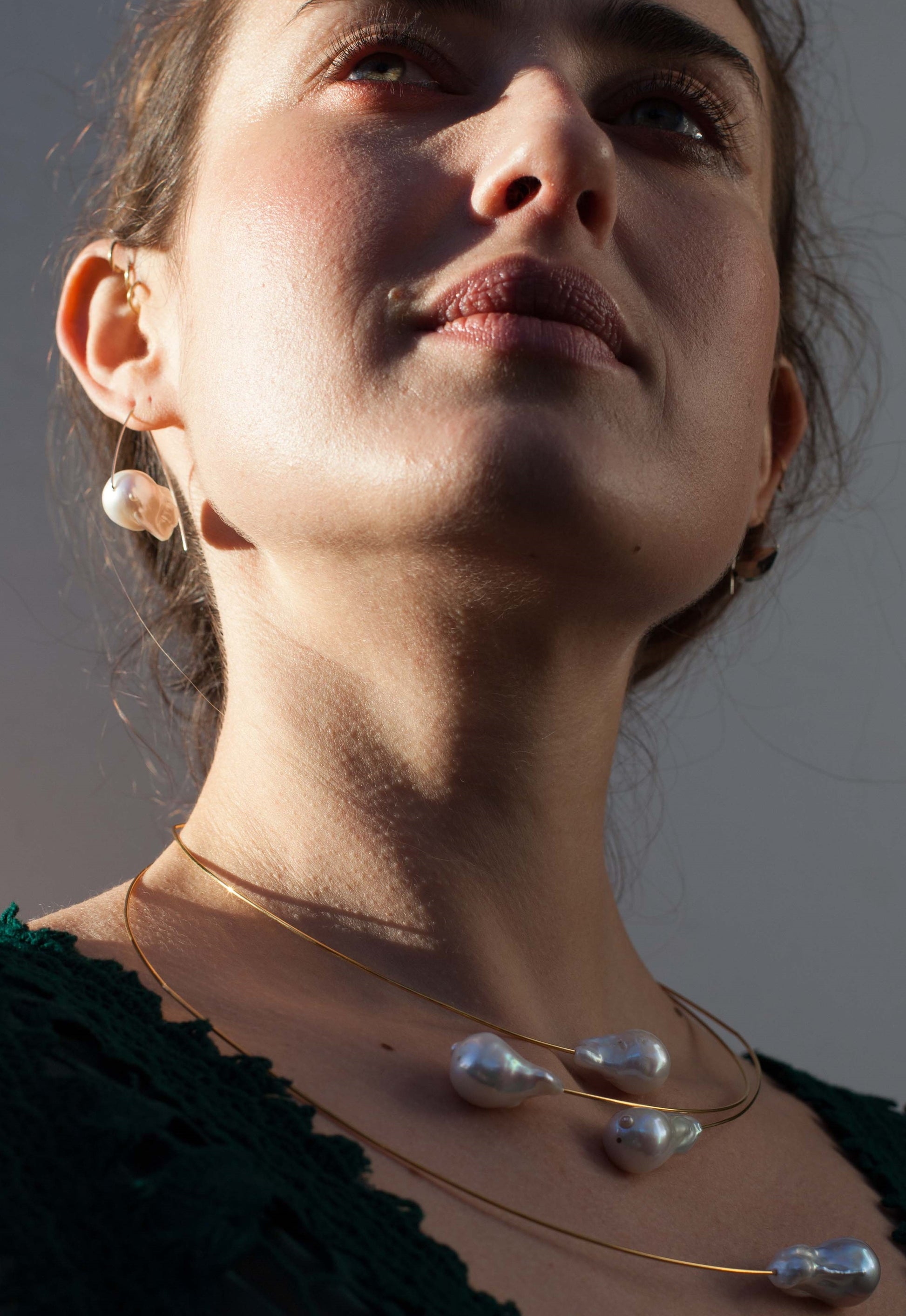A Luxurious pair of large Gorgeous White Baroque Pearls sit at either end of this angular asymmetric neck wire. This statement neck wire sits perfectly on its own or for a bolder look layer up with our other neck wires.