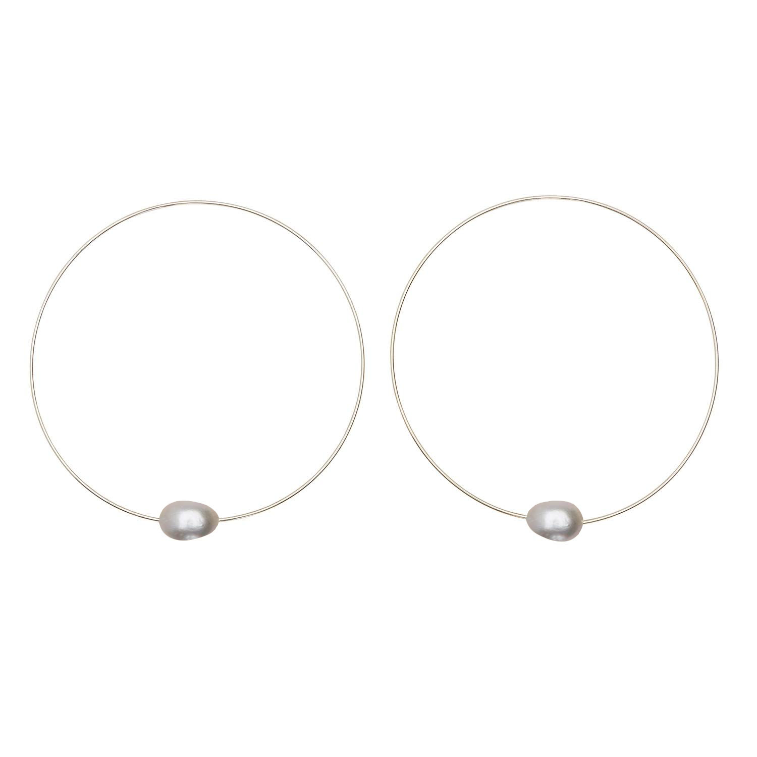 These classic large sized wire hoops hang elegantly with luminous oval shaped pearls! A fantastic pair of everyday hoops!