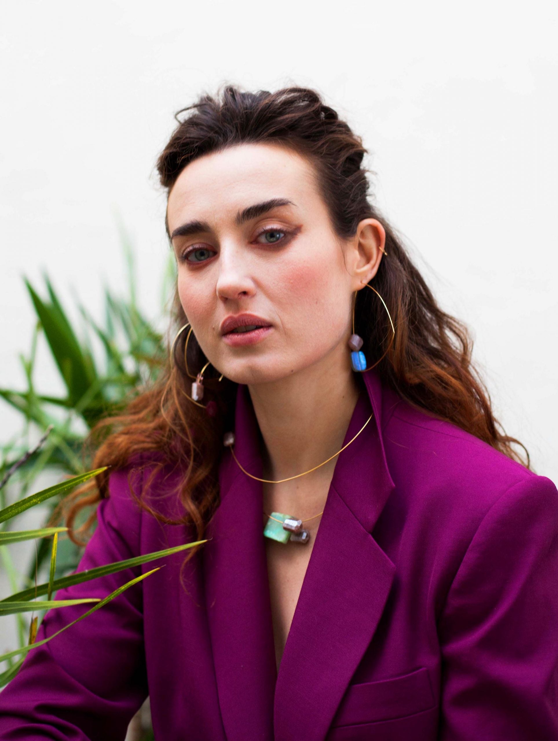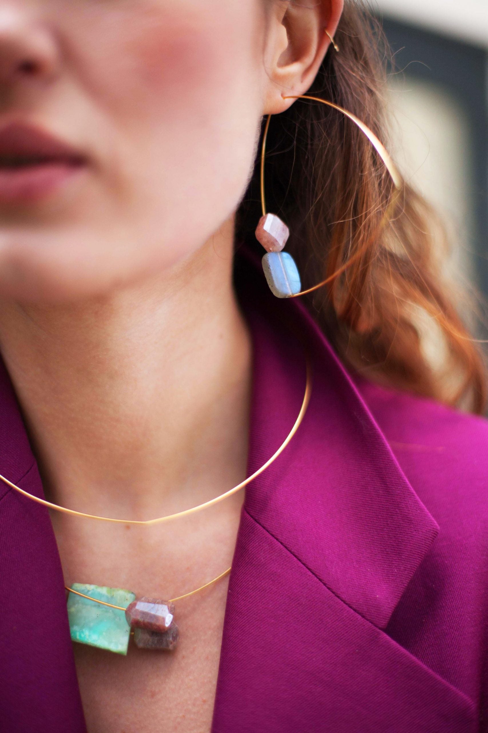 Spectacular ocean blue gems hang on the ends of these triangular earrings - stunning to wear for a party or even just a day out, as you can see our Creative Director Mel sporting them on her day off!