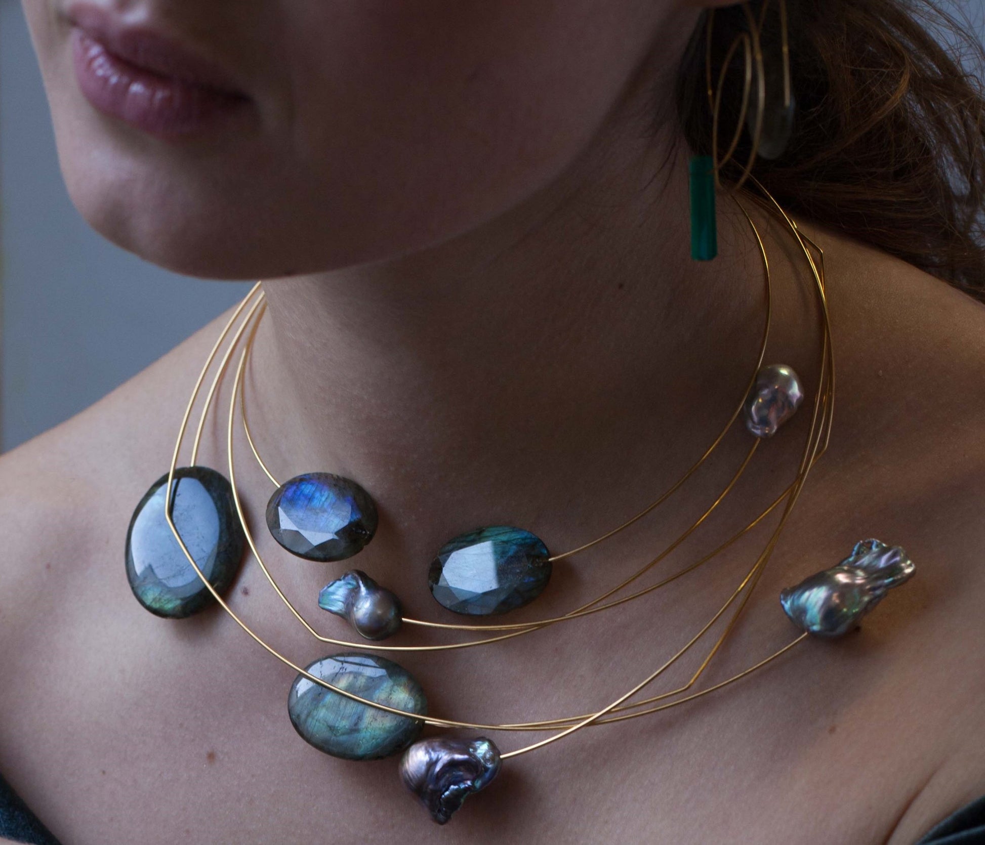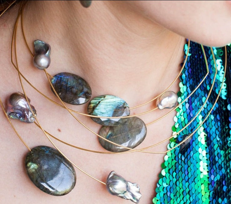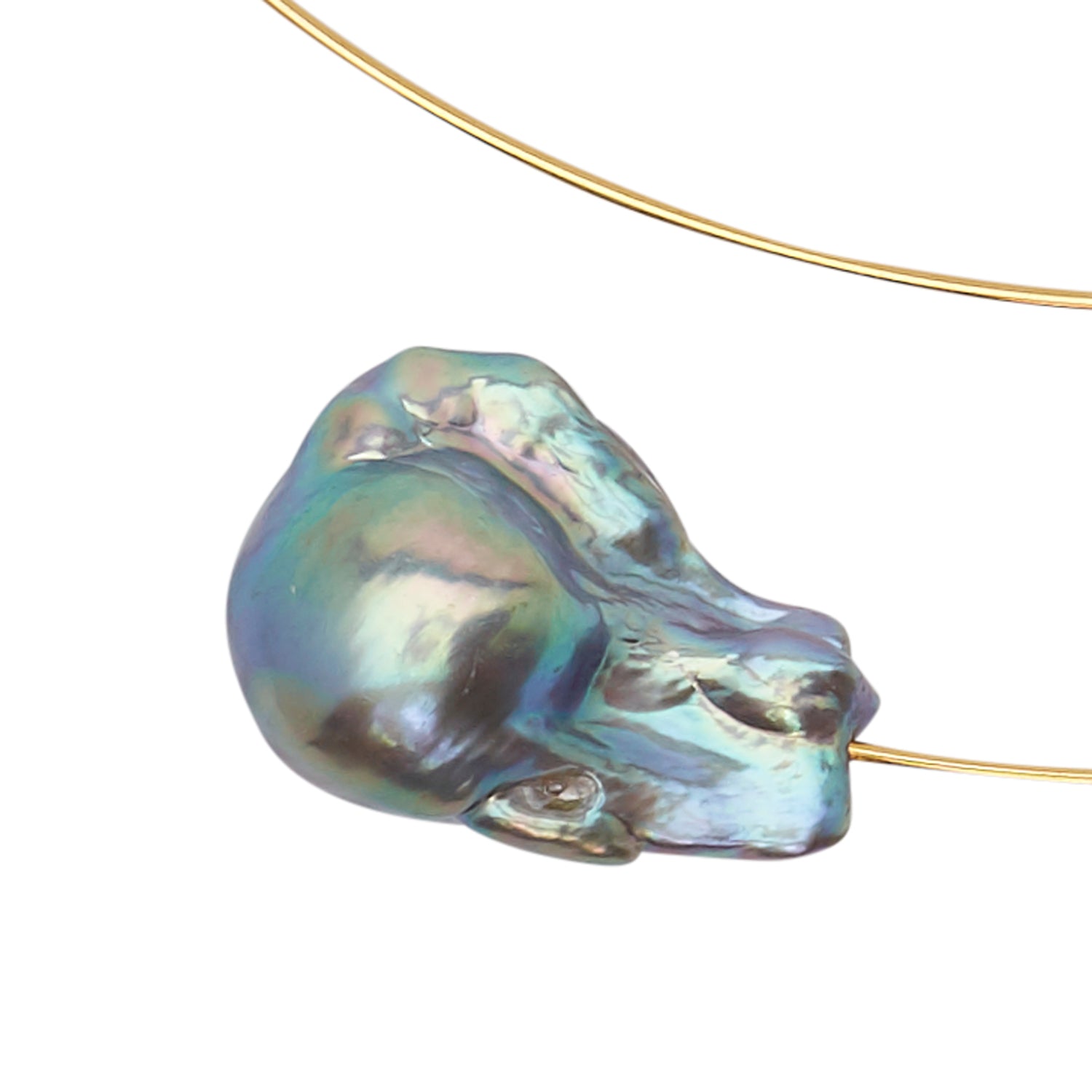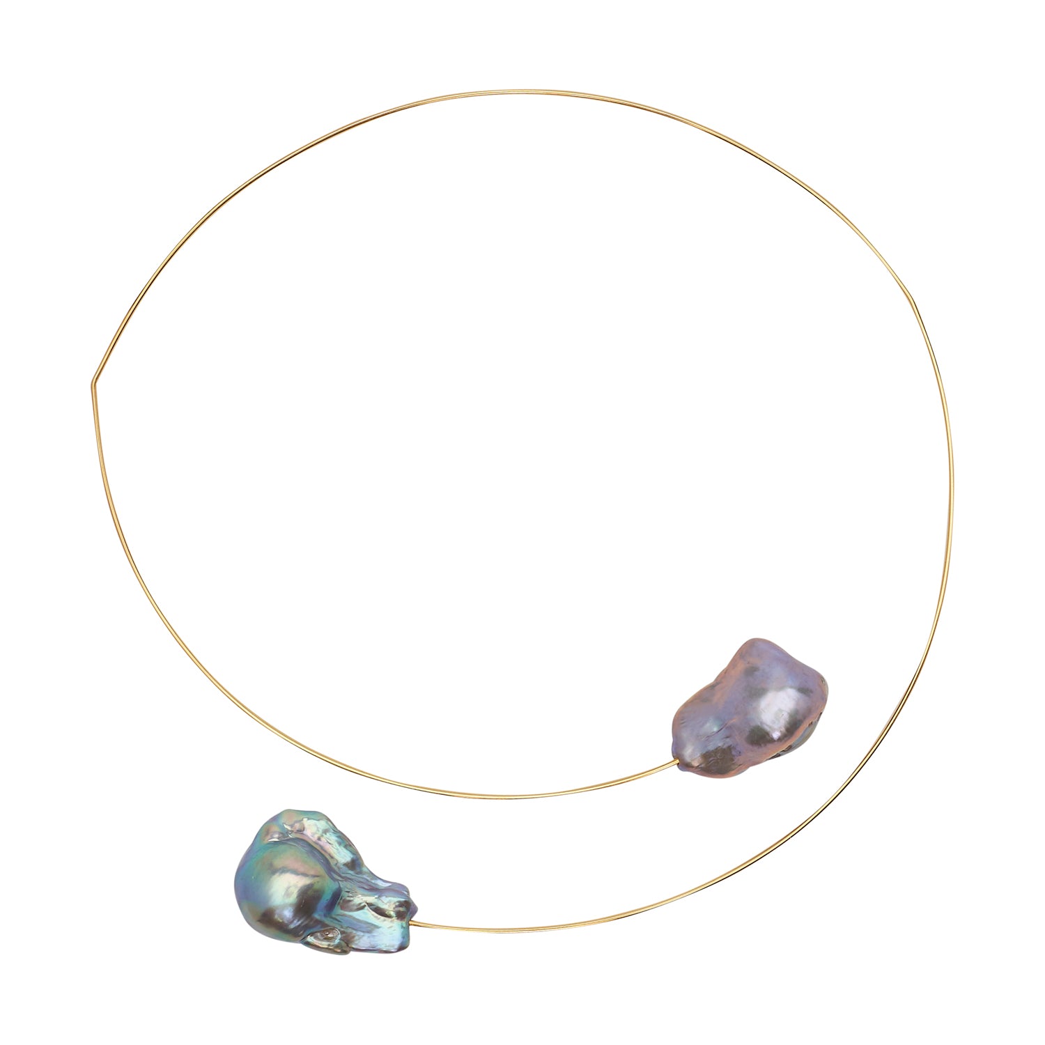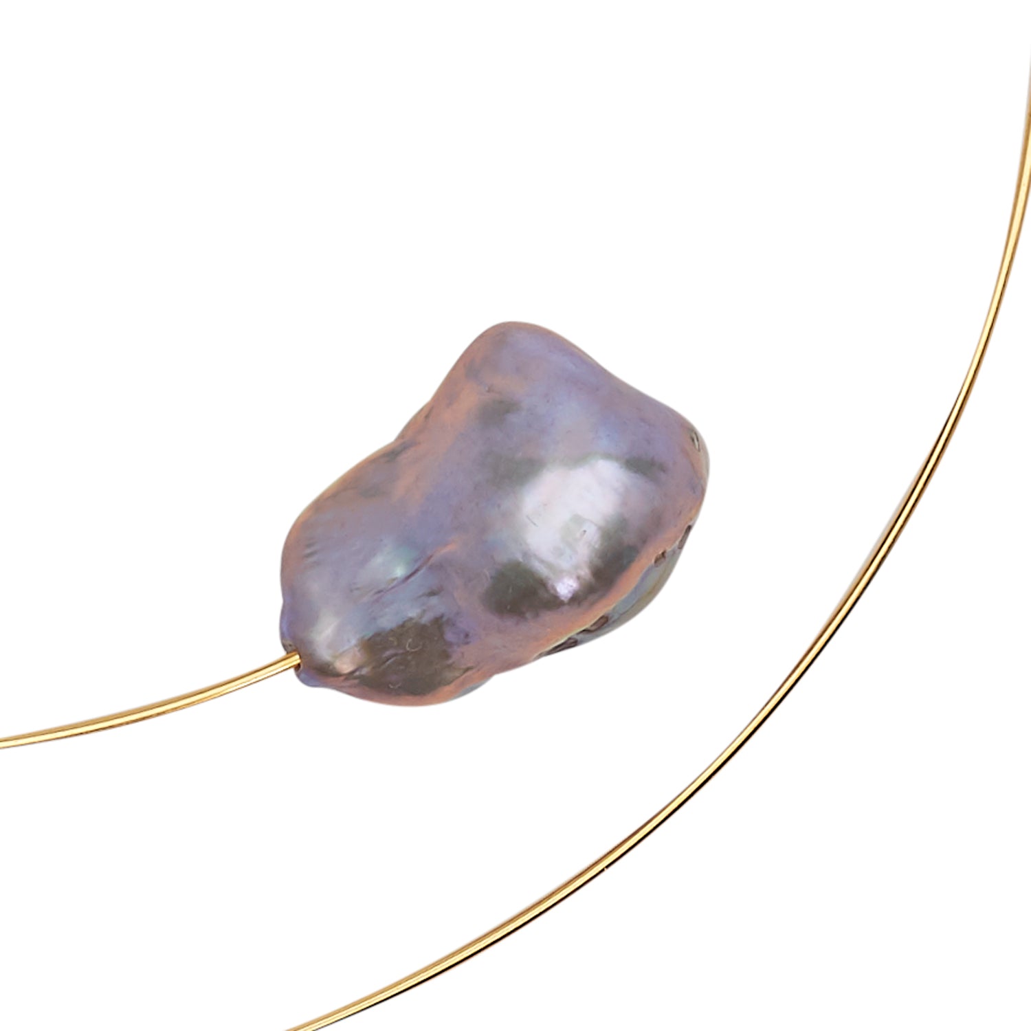 A Luxurious pair of large Gorgeous Grey Baroque Pearls sit at either end of this angular asymmetric neck wire. This statement neck wire sits perfectly on its own or for a bolder look layer up with our other neck wires.