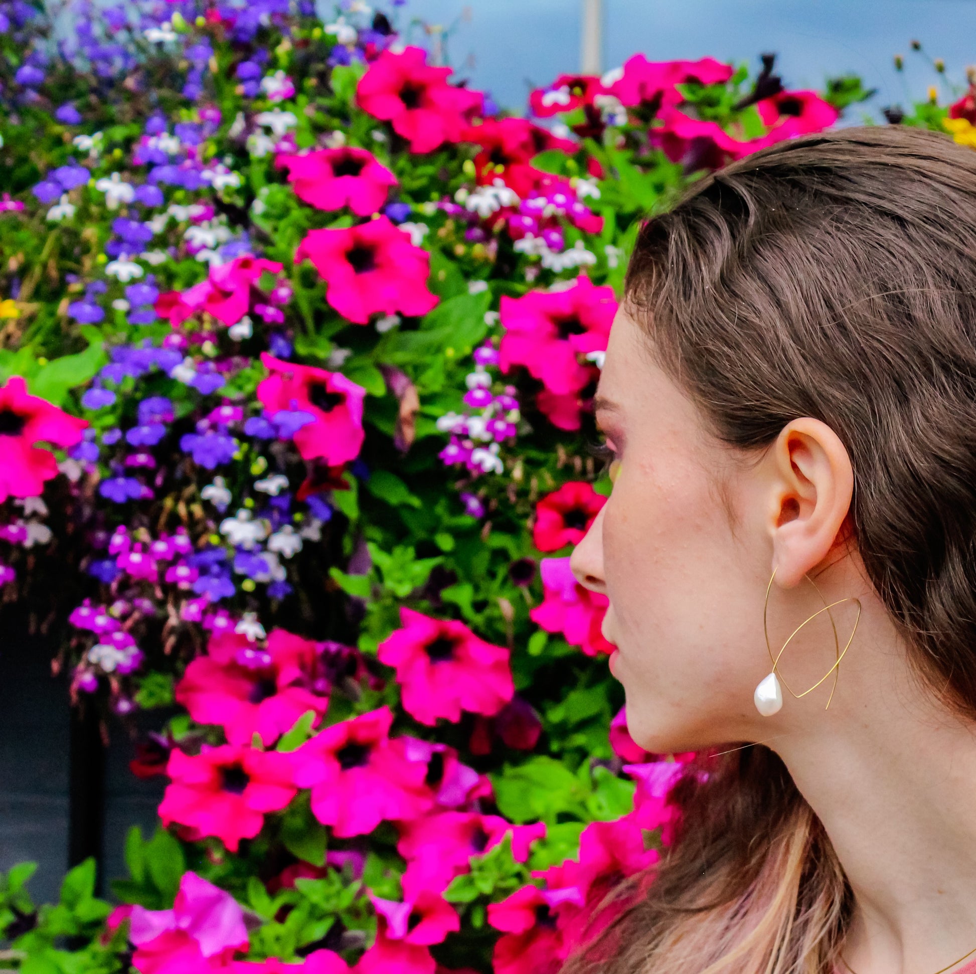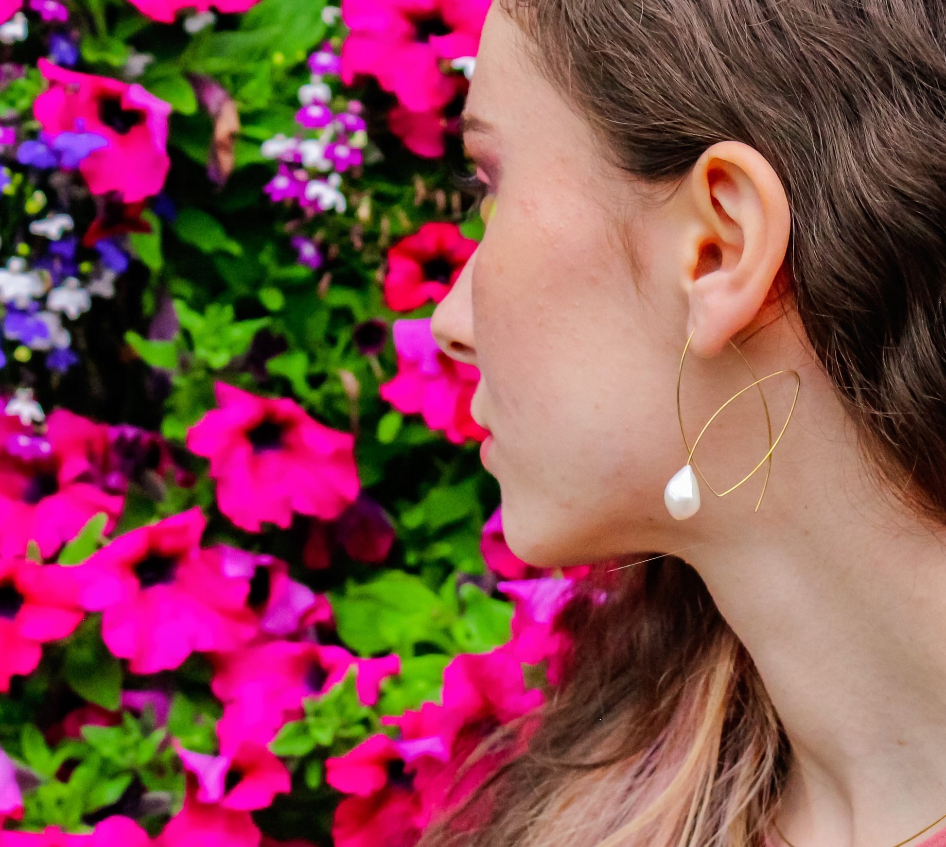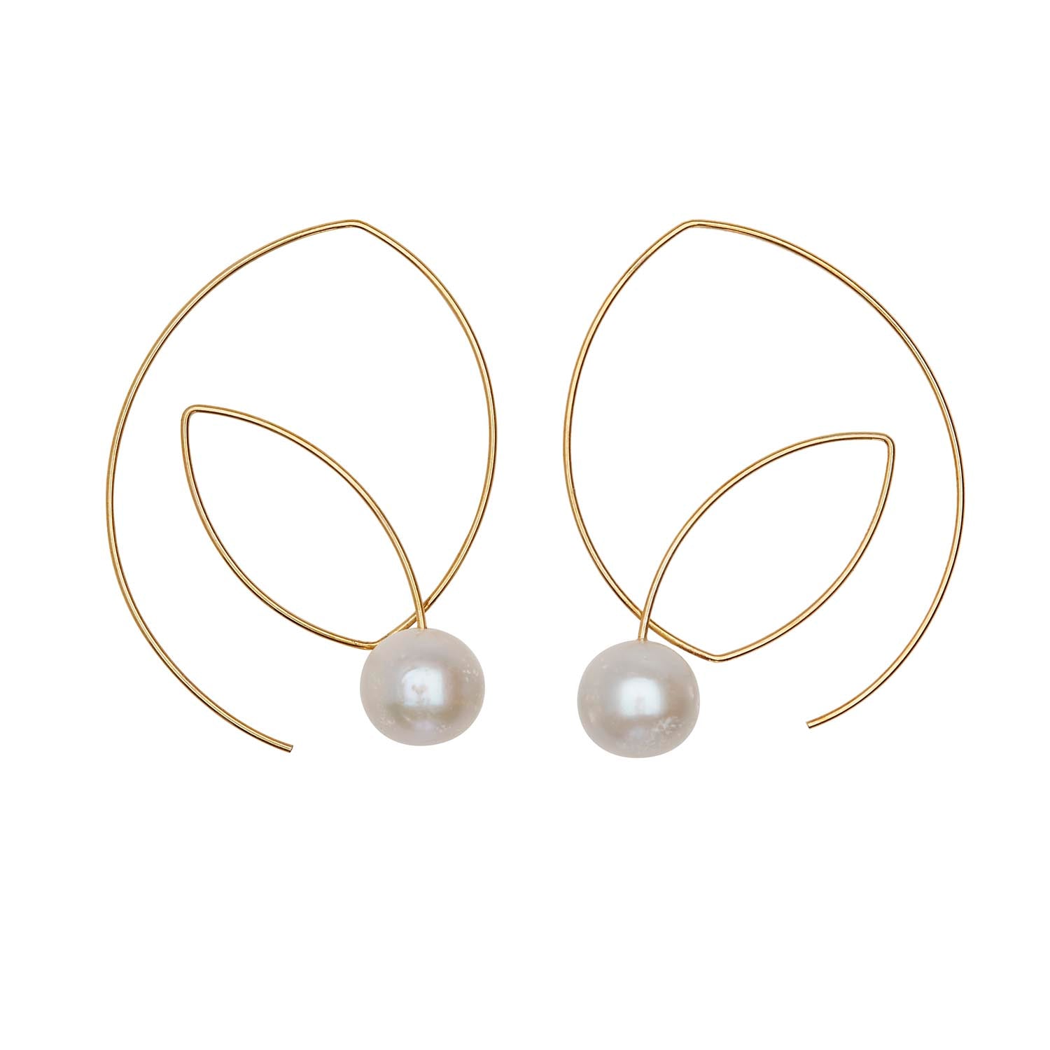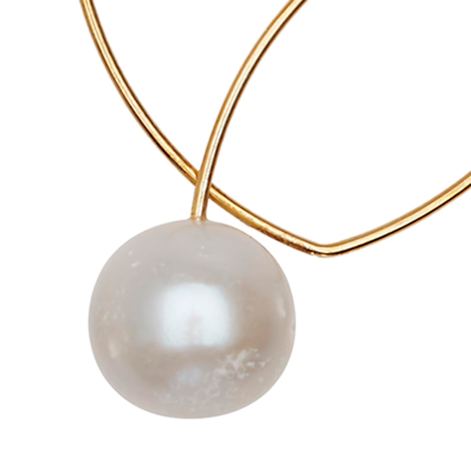 A modern and intricate pair of loop earrings with freshwater pearls. Great when worn with swept up hair!