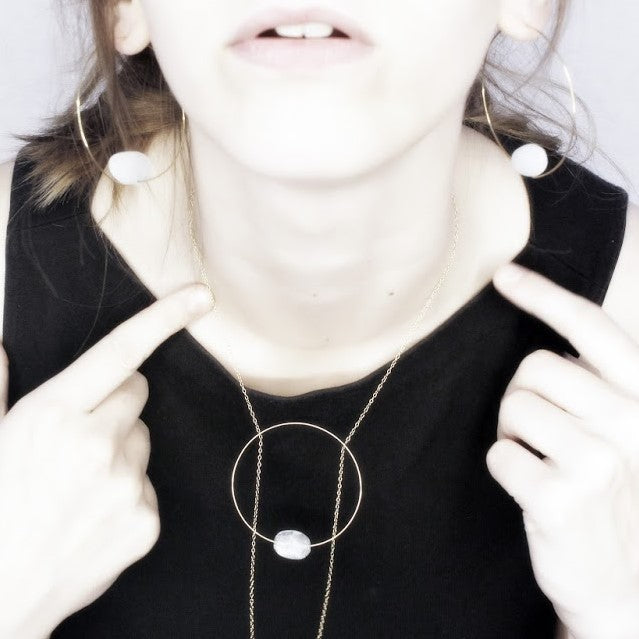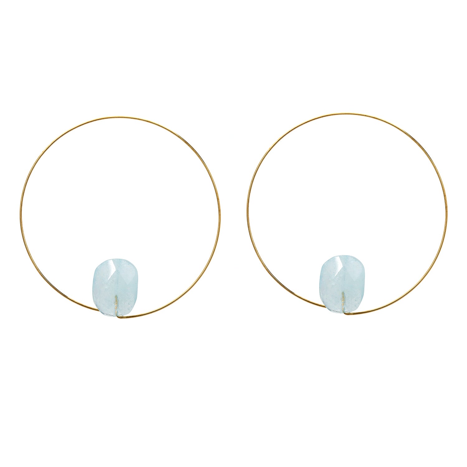 Large faceted aquamarines in pale blue appear to be floating on wire hoops. Hoops are a necessary staple to any jewellery wardrobe and these will become an instant classic for you.