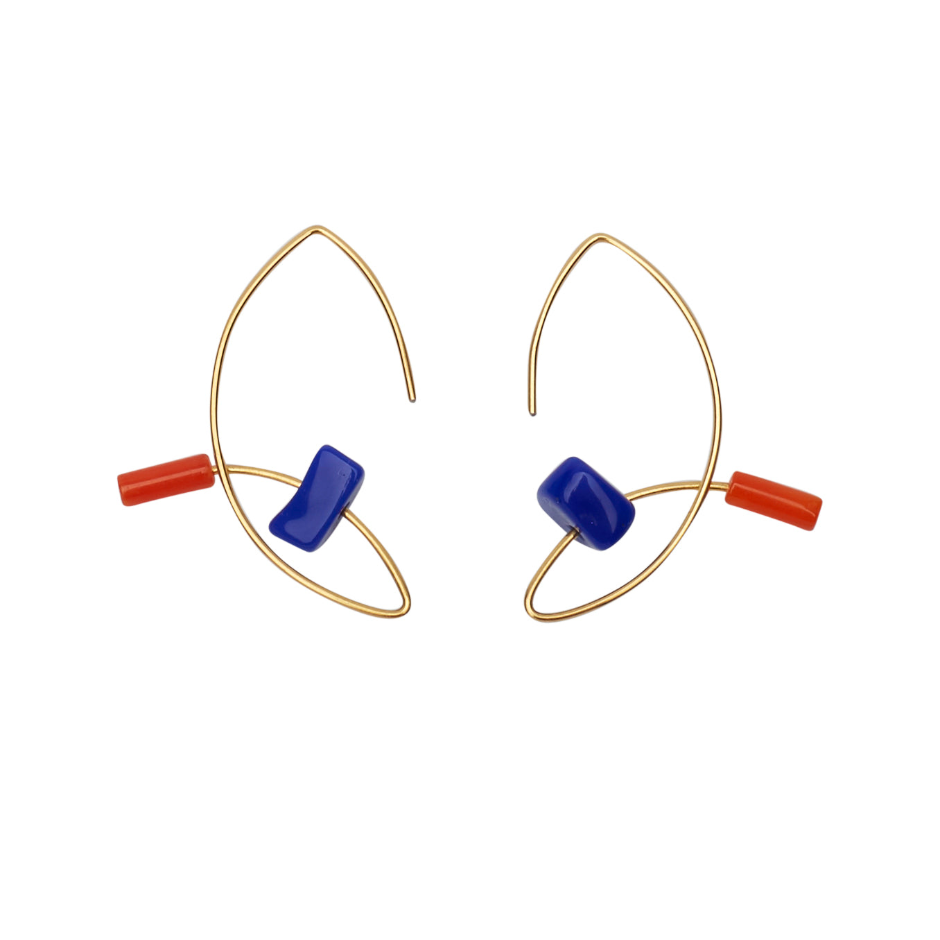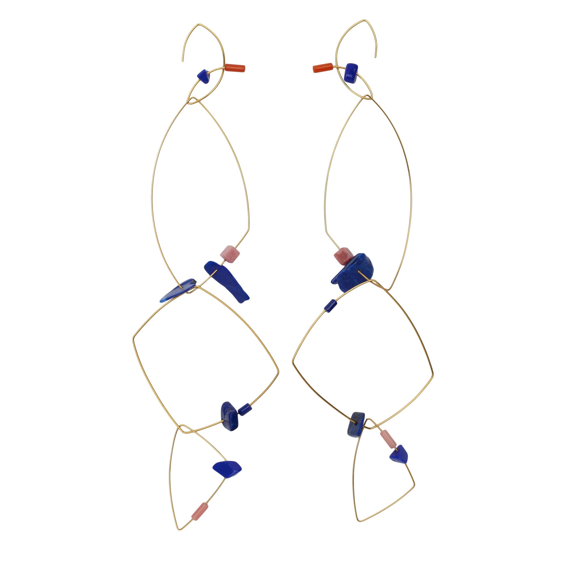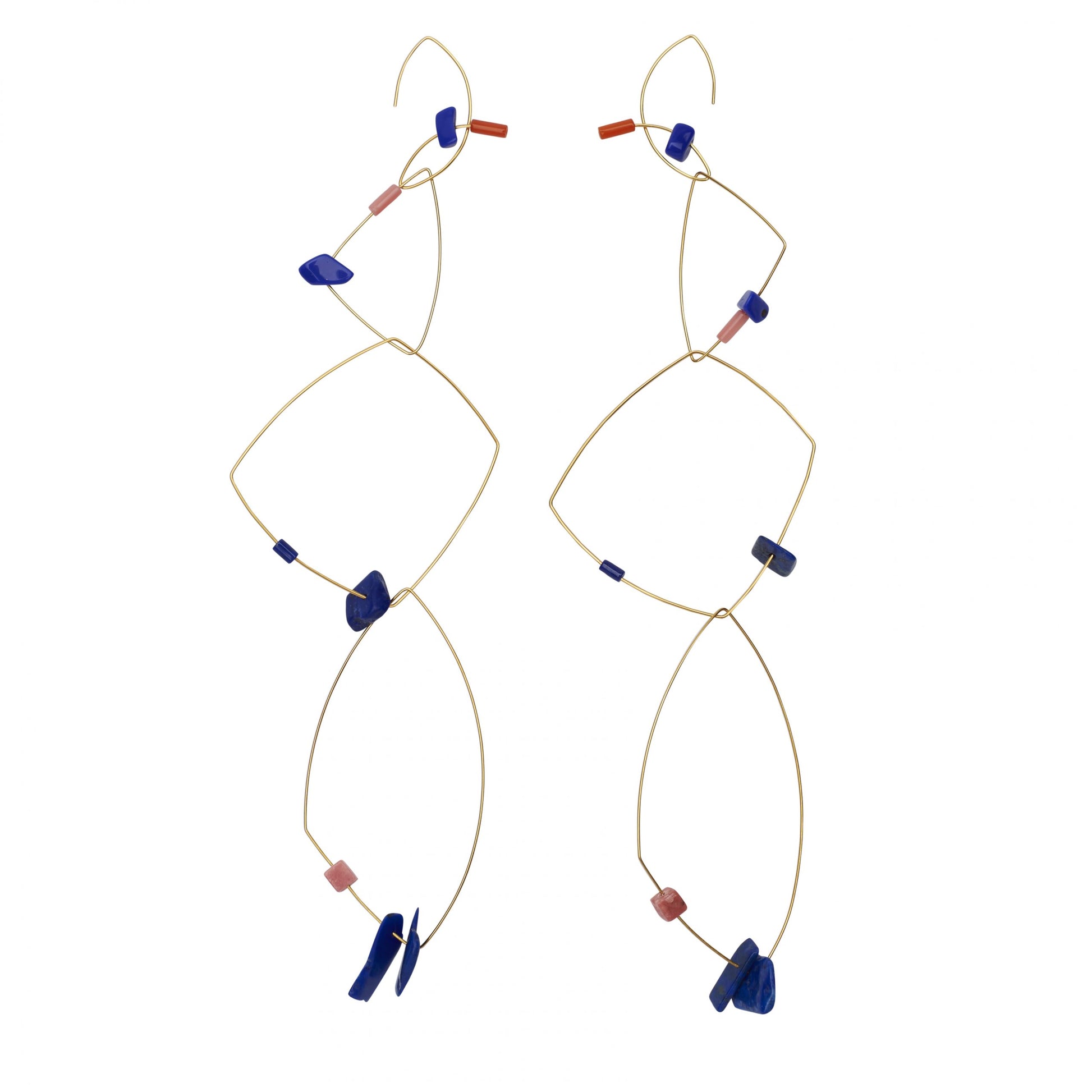 A glamourous pair of earrings with royal blue Lapis Lazuli and colourful Coral and Rhodochrosite - this pair will sparkle as simple studs or long and elegant with the triangular pieces for a full effect.