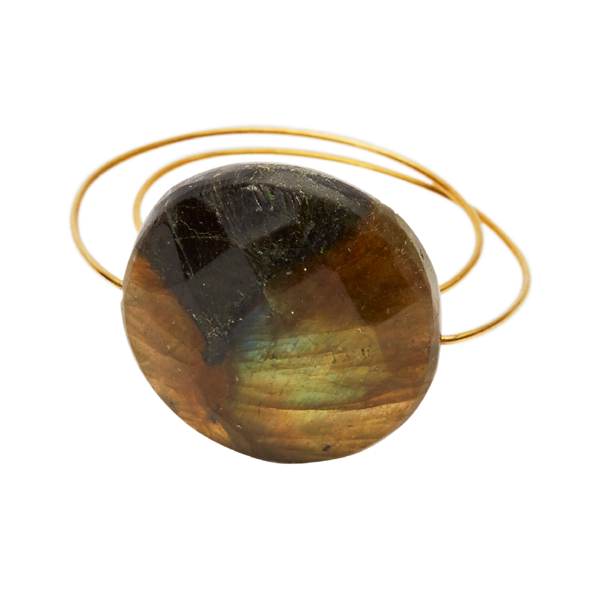 Labradorite is a semi translucent grey coloured gemstone with iridescent streaks of wintry blue, violet and sometimes green metallic flashes. A hypnotising gem that is versatile to wear with any outfit!